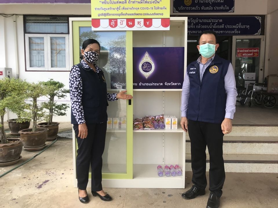 ประธานแม่บ้านมหาดไทยอำเภอแม่ระมาด นำเครื่องอุปโภค บริโภค เติมลงในตู้ “แม่ระมาดปันสุข”